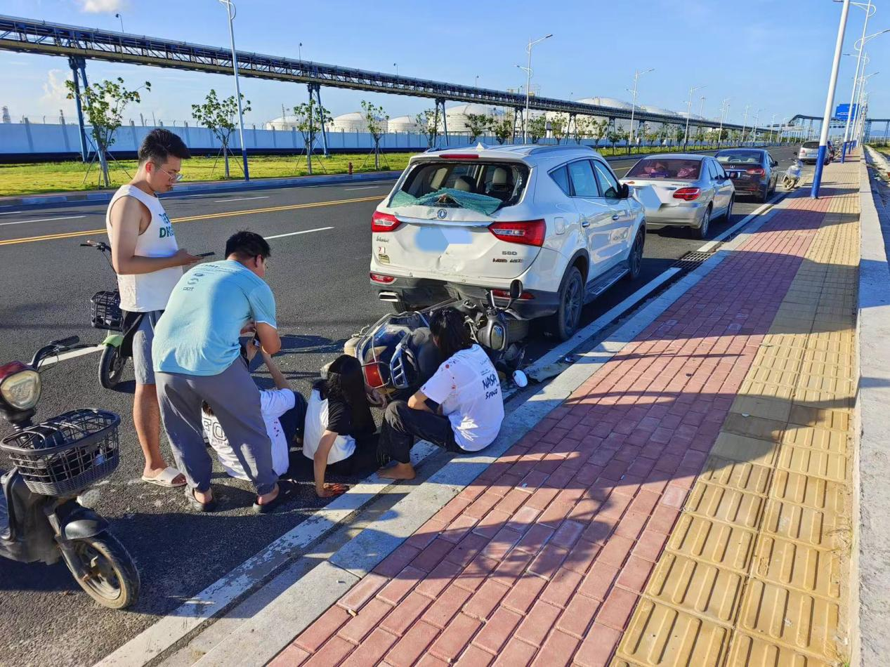 近日,在大南海石化工業(yè)區(qū)環(huán)海南路發(fā)生一起交通事故,兩位年輕人的暖心行為引起了廣泛關(guān)注。據(jù)了解,7月24日下午15時許,一輛電動摩托車撞上了停放在路邊的小汽車,三位女孩受傷,其中,兩名女孩傷勢嚴(yán)重,躺在地上無法動彈。就在這時,兩位年輕人跑了過來,向其中一位傷勢較輕的女孩了解具體情況,對另外兩位女孩子進(jìn)行安撫陪伴,并聯(lián)系小汽車車主。此時,另一位好心市民也跑過來幫忙,撥打了110和120。兩位年輕人一直陪伴在三位女孩身邊,直至救護(hù)車將她們送到醫(yī)院治療才離去。
