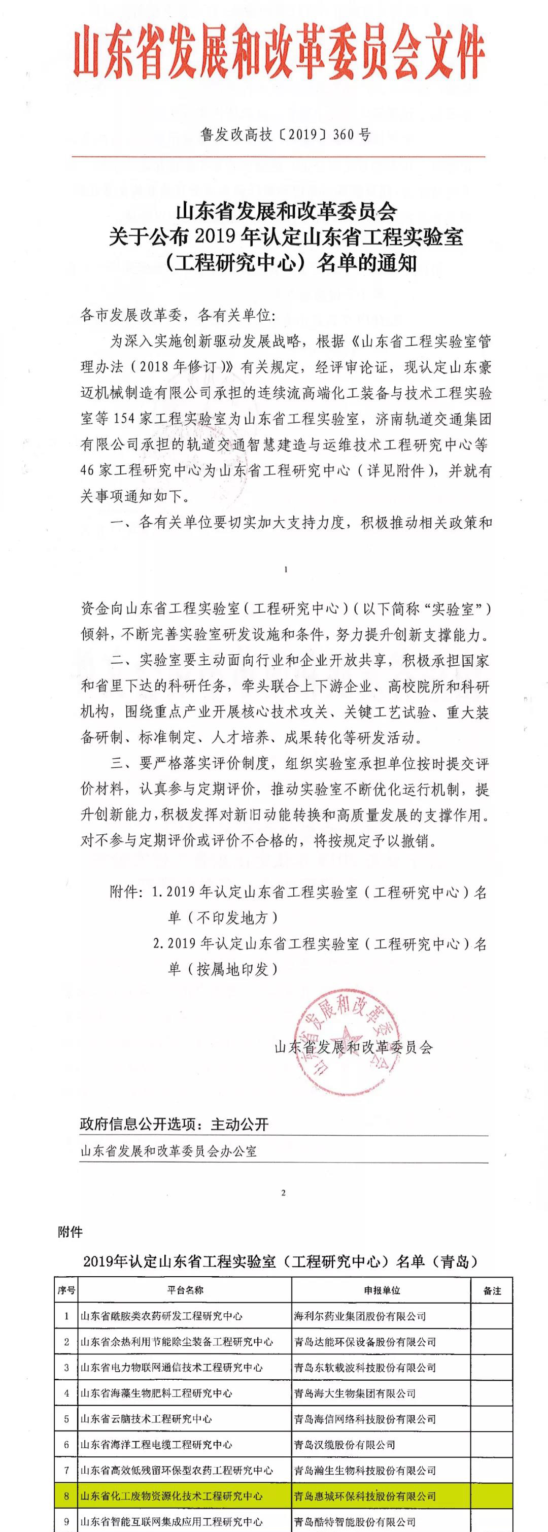 日前,根據(jù)山東省發(fā)展和改革委《關(guān)于公布2019年認定山東省工程實驗室(工程研究中心)名單的通知》(魯發(fā)改高技〔2019〕360號)發(fā)布文件,我公司申報的省級工程研究中心獲批并被認定為山東省化工廢物資源化技術(shù)工程研究中心。